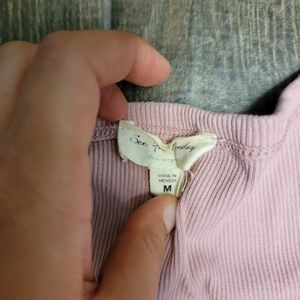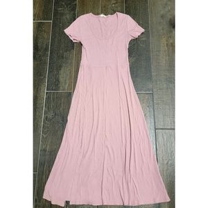 Round neckline, midi length (hits under the knee), front right left slit. Very stretchy fabric.