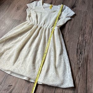 Great condition! Super cute lace off-white or cream mini dress with second layer of fabric underneath. Mesh / see-through details on the shoulder sleeve area. Cinched waist for comfort. Originally purchased from Francesca’s. I wore this to my bridal shower - so would be perfect for a future bride!
