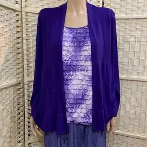 This is a beautiful frilly purple longsleeve top with a faux cardigan. It is from Notations and made in the USA. It is in good condition as shown in photos. This will fit size: L, actual measurements to follow: