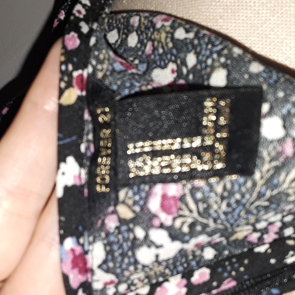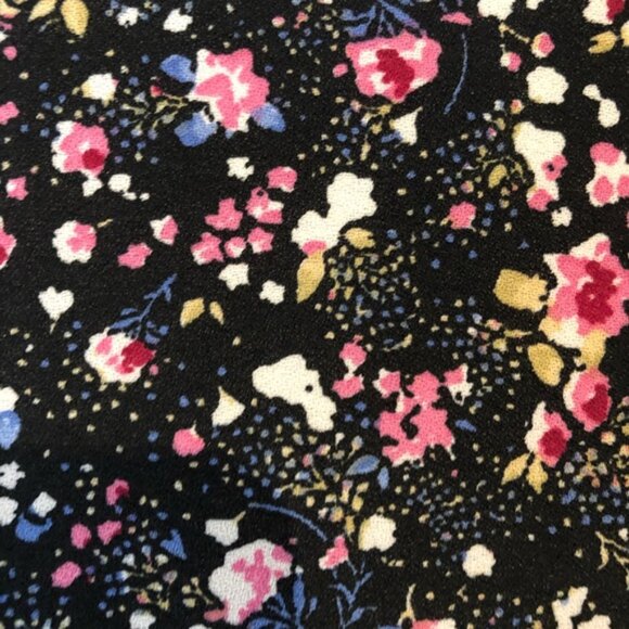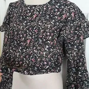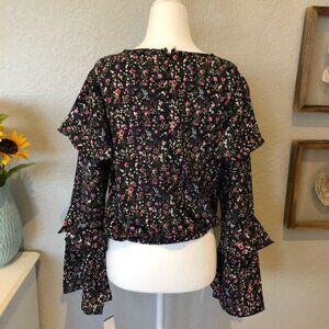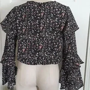 Forever21 ditzy floral, ruffle sleeve boho blouse, sz Medium. Pretty, versatile, weekend, party or office-ready top with multiple tiers of ruffles down long bell sleeves, elastic gathering at waist for the perfect tucked in look every time! Black with pink, ivory, blue & gold ditzy floral print. 100% polyester. High scoopneck, zipper top back with hook & eye closure - missing hook, bought that way, easy fix; (see pic) & two minor runs - at ruffle edge and bottom of one sleeve (see last pics), they hide well in pattern, really have to search for them - price reflects flaws. Otherwise excellent! #floral #ruffle #weekend #office #party #pretty #gathered