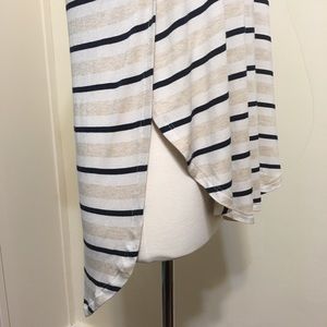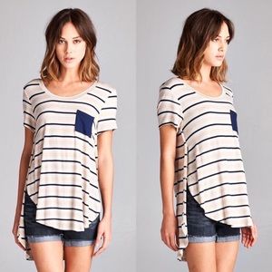 Trendy high side slits with a high low shirttail hem, striped pattern, and patch pocket. Comfortable and easy to wear. Perfect with shorts in sunny weather and leggings in cooler weather.