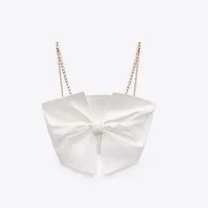 Straight neck crop top with straps. Front pleated self bow detail.