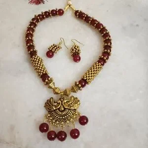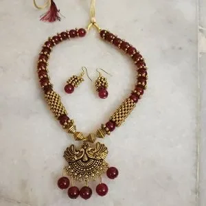 Golden oxidised Pendant necklace with maroon beads and small hanging earnings.