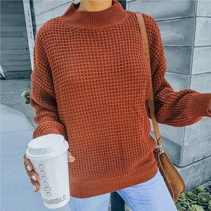 This mock neck waffle knit sweater in clay is set to become a wardrobe favorite for your fall wardrobe!