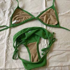 Bikini purchased years ago. Has been worn but not often and just sitting in my closet. No rips or stains. I’ve included pics of loose threads on the top. Very minor, one is where gap’s logo was sewn on and fell off. The bottom still has it attached. The top is size L, bottom XS