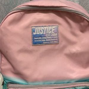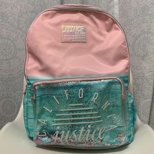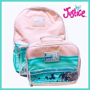 Justice California Backpack & Lunchbox Lunch Bag Pink Aqua Turquoise Teal Light Green 2 Piece Set Was used for half a year of school during the school closures of the pandemic. Her name is written with a sharpie. Some scuffling in some areas AS SHOWN IN PICTURES AND VIDEO! Super cute backpack for Elementary or middle school. Beautiful colors and the pocket has sequins that shake when child shakes the backpack π