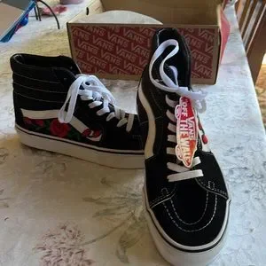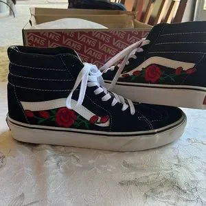 These Vans are black suede and have a custom done red rose. They are a size 9.5