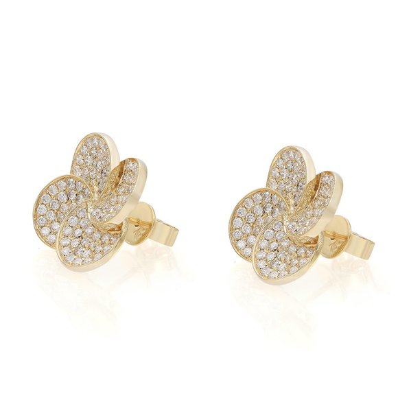 Pave Set Round Cut Diamond Flower Stud Earring 18K Yellow Gold 1.45Cttw