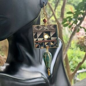 Handcrafted Paper Earrings. 1 3/4" Squares with Czech Glass tear drop beads. 14k gold plated earwires.
