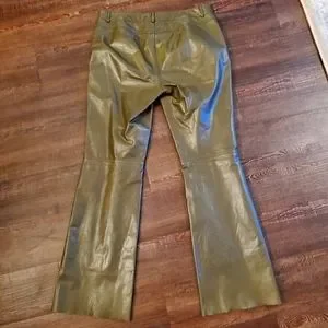 Beautiful flared, hunter green, leather pants. Fits like a glove. Can we worn with pointed flat or stilettos shoes or boots. Can be dressed up or wear casual with a graphic t shirt. Purchased at Neiman Marcus. Loved them but now too tight. 🤪