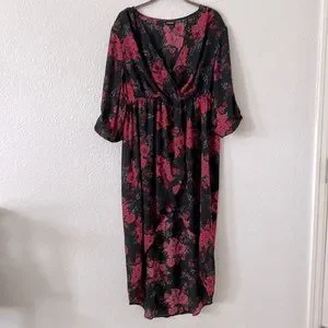 Torrid dramatic high low tunic shirt. Silky with red floral detail. Wrap style with 3/4 sleeves. Like new.