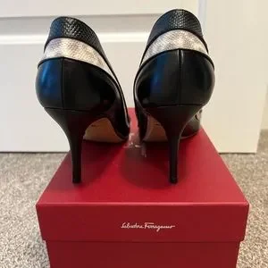 Salvatore Ferragamo black leather heels. Like new, excellent condition. No sign of wear/ scratches other than soles as pictured. Leather in pristine condition. Worn only once. Size US 10. Comes with original box, dust bag and product card. Classic style, perfect for any wardrobe.