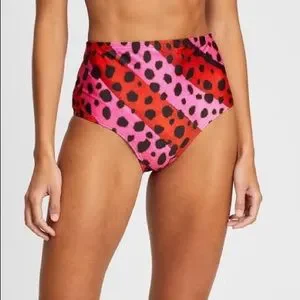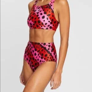High-rise cut; moderate coverage to rear. Quick-drying ECO swim fabric; generous stretch; lined; opaque. Vibrant pink and red stripe with black cheetah print. Embroidered branding with Speedo logo to rear.