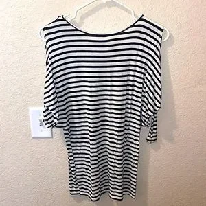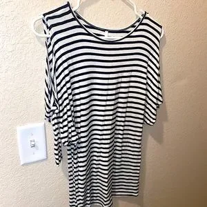 The striped shirt has hardly been worn and is in great condition. The sleeves have cut outs on the top so your shoulders are shown, almost like a tank top.