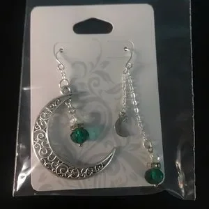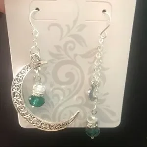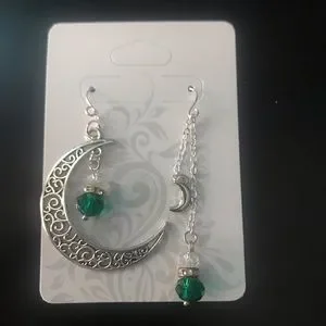 Handmade earrings. Moons. Moon Earrings. Green Diamond earrings. Green Crystal earrings. May. May babies. Green birthstone. Dangly moon earrings. Silver moon earrings. Elegant moon earrings. Elegant. Pretty.
