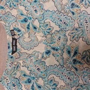 ZERO ZERO womens medium paisley print sleeveless top with bugle bead,sequin detailing. Beautiful navy,turquoise, hints of brown on a bigger background. sheer fabrication. Beautiful with a silky cami and some linen or wide leg pants. Denim of course !! Pair up with denim shorts or Bermuda both of which you can find in my closet !! Bundle and save!