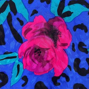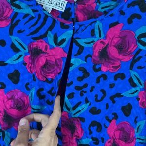 Stunning royal-blue silk party dress in a bold, rose and animal print! Features shoulder pads, batwing arm and tapered sleeve, defined waist with statement buttons, tiered skirt, side bow, and peek-a-boo openings at bodice and back. Lined, zipper at waist.