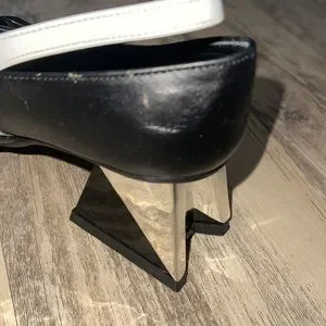 NEW! Beautiful black and white strapped heels features buckle strap and very unique heels. There are a few very small marks on the inner side of right shoe (see pics) that aren’t very noticeable. Shoes are size 6.5. Fast Shipping! 🛫