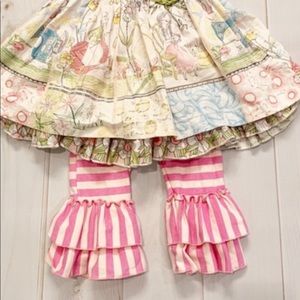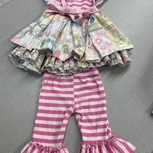 EUC two piece in a cute print with striped ruffle leggings.
