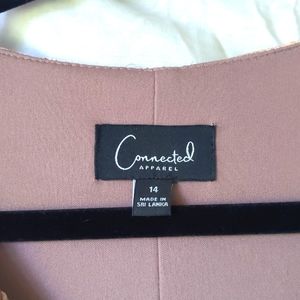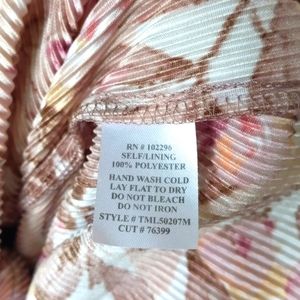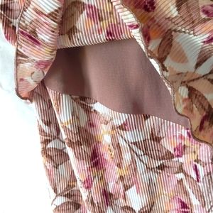 Connect Apparel v-neck elastic dress with a faux pleat, tan and pink floral, and elegant ruffled layered design.