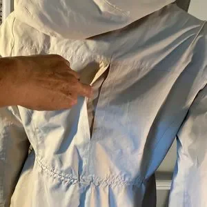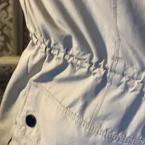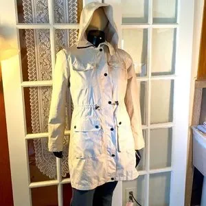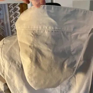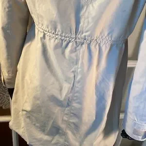 This is a Michael Kors jacket, 3/4 length . Tan jacket with black snaps and zipper up front . .MK on sleeve . Adjustable Velcro strap on wrist . Light weight and great looking very nice. Worn once . Good condition no tags