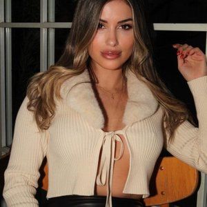 Cardigan with faux fur lapel and long sleeves. Front tie closure.