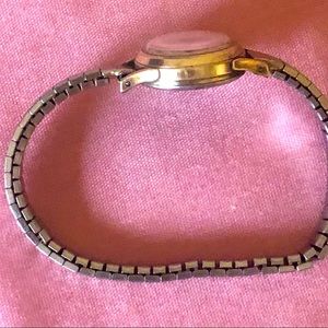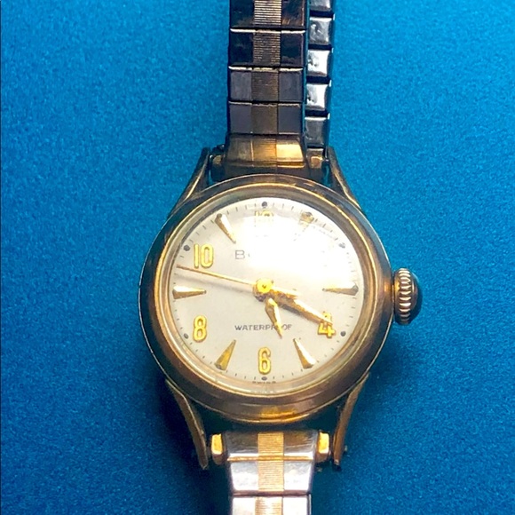 1960's rare vintage gent's Bulova time piece stainless steel with 10kt GF, adjustable strap made in the USA, wind time piece with analog face, crystal face has no scratches, face is cream colored with the markers, hands and second hand are gold GF. The band is silver and gold plated, waterproof up to 50 miters, it also display's the name on the crown. approx. 20 mm in size across the face, the band is 5 mm wide, with the size it would be perfect for a woman's watch. This watch does work, it is a beautiful piece see the picture's. There is some hazing.