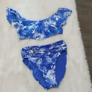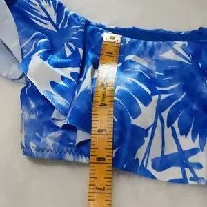Detailed with flirty ruffles, this beautiful off-the-shoulder bikini top with tropical blooms is perfect for laying poolside or strolling along pristine beaches.