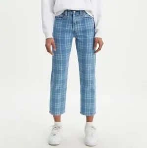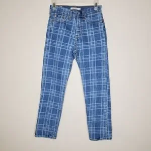 Levi's x Free People Blue Plaid Print High Rise Button Fly Wedgie Straight Jeans