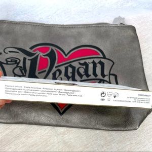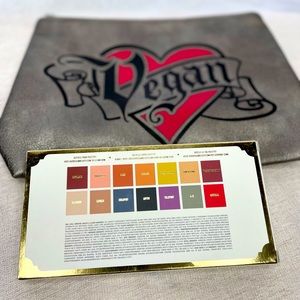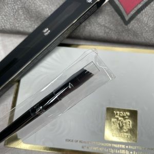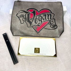 Brand new unused 3 pc set. KVD Palette with the eyeshadow protective insert still in place and in box, eyebrow brush is in original packaging and a cool KVD makeup bag also included which measures approximately 11" x 8" x 3".