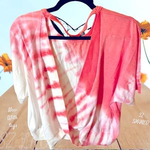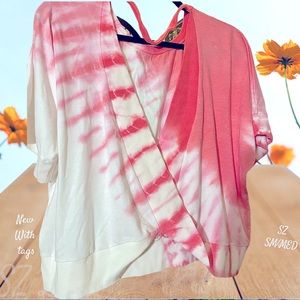 NEW WITH TAGS MYSTEREE BRAND UNIQUE TYE DYE TOP, open v-neck front with twist at bottom center, Wear with v-neck in front of the back- Soft and lightweight material, single strip front neck collar, wear over tank Top or turtleneck, etc. Size says Small/medium but definitely Oversized .