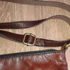 Small brown leather Authentic Fossil crossbody purse. Buttery soft leather accented with brass hardware and black top stitching. Zip top closure with front zip pocket. Inside is lined with a zip pocket and a flap pocket. Bag measures approximately 8x8. Like new-barely used!!
