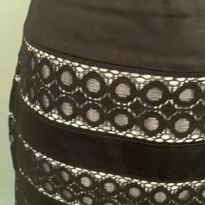 Beautiful and timeless, this piece will fit well into any wardrobe. I’ve worn it for work events with a blazer, and causal events as well. Worn only a few times, it’s in great condition. Fully lined as shown in the pictures, it creates a very nice tailored silhouette. The white fabric peeks through the black to create the stripped design. 22.5 inches long, 15 inches across the waist.