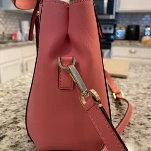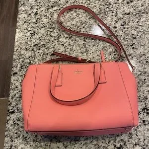 Medium sized pink kate spade bag with adjustable strap. In good condition, slight discoloration in spots due to normal wear and tear (see last 2 photos).