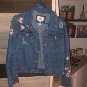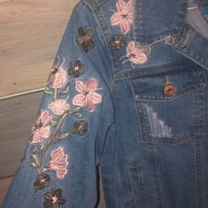 Embroidered flowers at the bottom of one sleeve and by the shoulder of the other