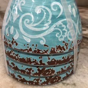 Pretty medium-turquoise color with medallion swirl all around the outside and brown speckled rustic edge as shown.