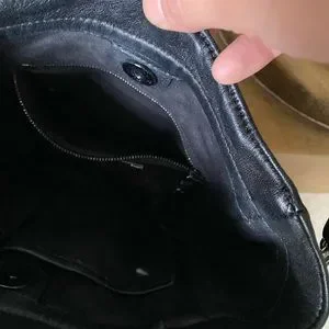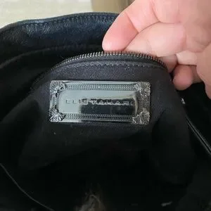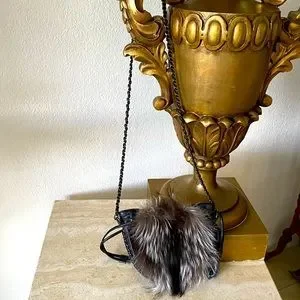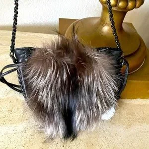 ELIE TAHARI Lamb-leather crossbody bag. The bag has fox-fur accents on one side. The strap is charcoal metal and leather. Inside zip-pocket. No signs of visible wear.