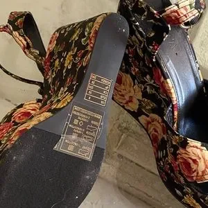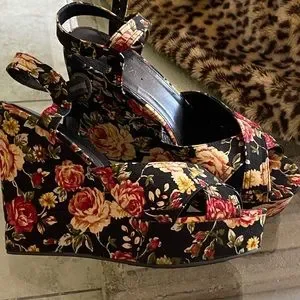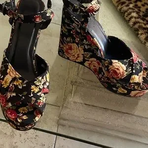 It pains me to sell these because I love them but I never wear them, They’re a cloth material with 4 inch heel and 2 inch wedge so not too hard to walk in. They look pretty new size 9, fits like a 8.5