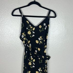 This black dress with floral print adds a little twist to your classic LBD. This relaxed fitting piece with spaghetti straps also ties at the waist. The lowback, v neck dress is a midi length wonder with adjustable straps and an attached belt. The perfect choice for your night out!