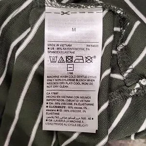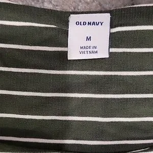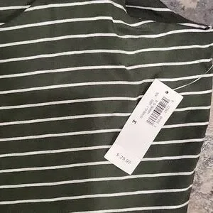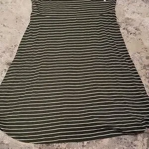 Fitted at top then flows away from body. Material does have stretch & flattering. Color is an Olive Green with white stripes. Length is 36" in. from shoulder to bottom hem, 21" in. from waist to hem & 16 1/2" in. put to pit across. Very cute dress to just put on & go!