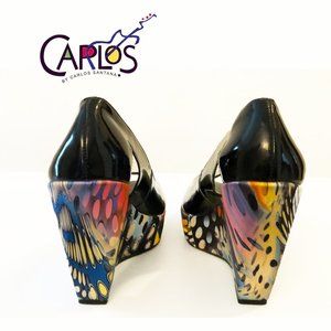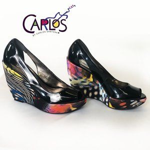 * Black faux patent leather upper, printed fabric around the heel and platform