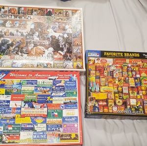 Lot of 3 White Mountain puzzles. All are used, I did not complete myself. It is unknown if all pieces are present. Purchased as is. The "Favourite brands" has corner damage. The dog one has pushed in top of box. All boxes intact. All 1000 pieces. I love this brand, but have too many puzzles waiting to be done!
