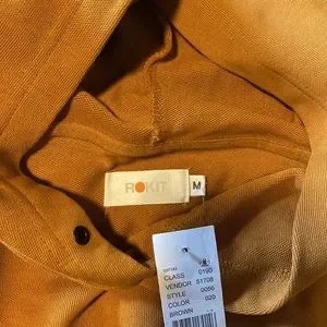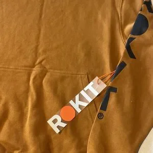 New with tags hoodie, I’m not sure if it’s missing the pull string for the hoodie or if it came like that but it’s in perfect condition other than that, color on tag says brown but it’s like a mustard tan color