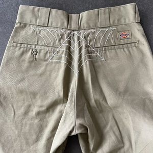 These were made by Sweet Leaf Studio out of England who no longer makes clothing so super special! Chain stitched on khaki size 29x32!