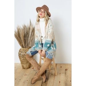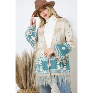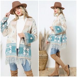 Beautiful colored teal and taupe bell sleeved knit cardigan sweater with an aztec tribal print. Detailed fringe along the bottom hemline.
