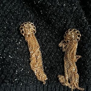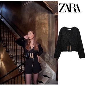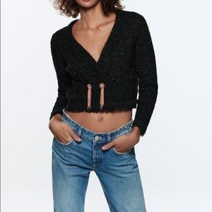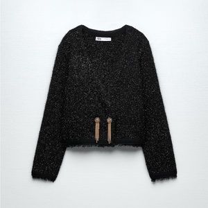 Jacket with a V-neckline and long sleeves. Metallic thread detail. Double-breasted snap-button fastening with golden chain tassel appliqués.