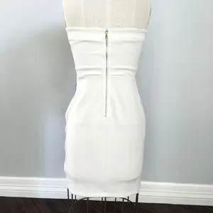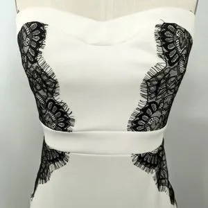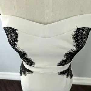 Guess brand dress in white with black lace applique detailing. It's a perfect dress for date night or a night out!