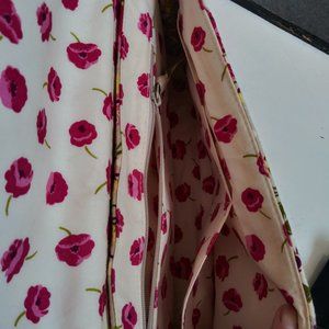 Inside has 2 open slide pockets and a small pocket with a zipper