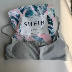 Still in the packaging. The color is a greenish grey color. The bathing suit says small but it seems to run smaller.