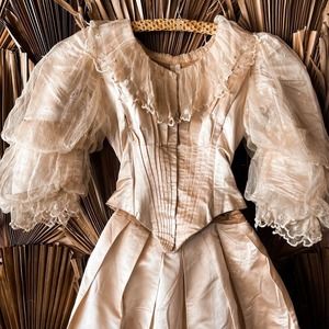 Antique 1830's Silk :Couture Wedding Gown Double Puff Sleeve Corset Bodice XXS